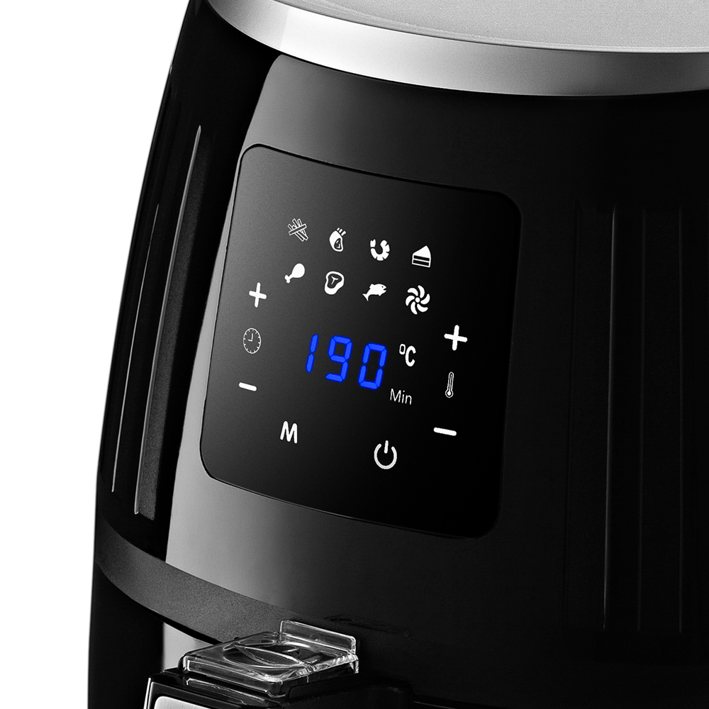 Аэрогриль оснащён электронным управлением, он имеет 7 автоматических программ. На дисплее отображаются температура и время приготовления. Внутри корпуса имеется внутренняя подсветка корзины. В инструкции представлены рецепты разнообразных блюд.