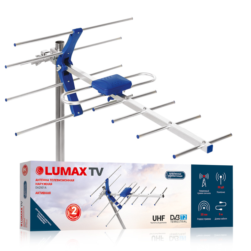 Модель телевизионной наружной активной антенны LUMAX DA2501А имеет удачную конструкцию, благодаря которой легко воспринимает сигнал в местности, где нет прямой видимости источника. Радиус приема – до 35 км, но благодаря встроенному усилителю с отличным усилением до 30 дБ можно увеличить расстояние до передающего телевизионного центра, а также можно разделить сигнал на несколько телевизоров. Устройство имеет интересный дизайн, хороший функционал и достаточно демократичную цену, способно работать и с аналоговым вещанием, и с цифрой, на старых телевизорах и современных, а также на цифровых приставках стандарта DVB-T/Т2. Очень быстро собирается и устанавливается, обеспечивает устойчивый прием и «картинку» без лишних помех. Коаксиальный кабель с волновым сопротивлением 75 Ом входит в комплектацию. Подарите себе и своим близким множество приятных часов у экрана благодаря простой настройке и качественному стабильному приему сигнала антенны LUMAX DA2501А!