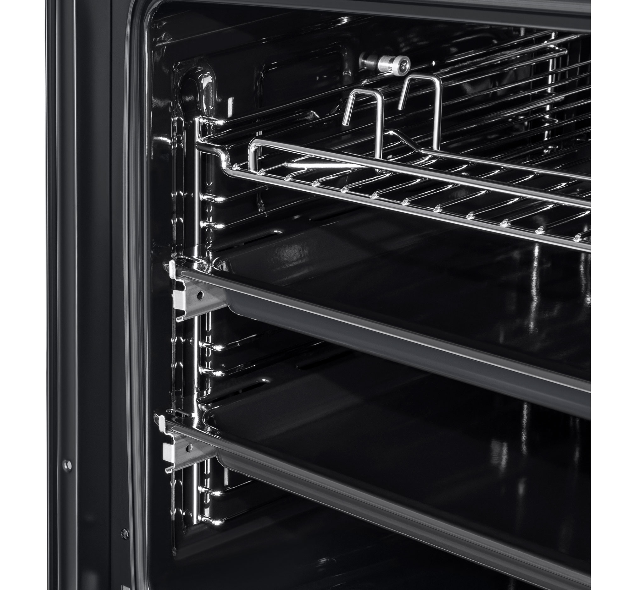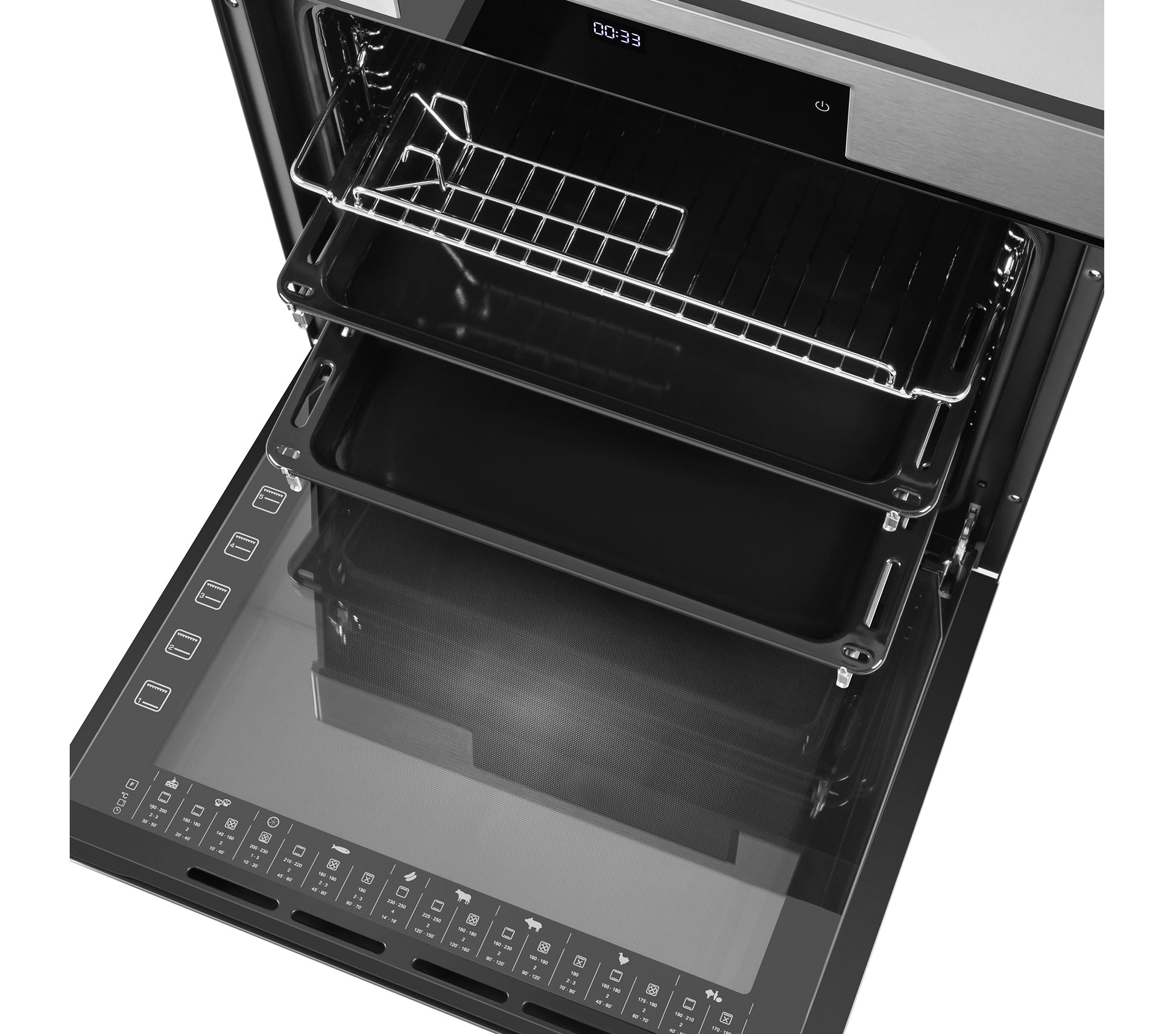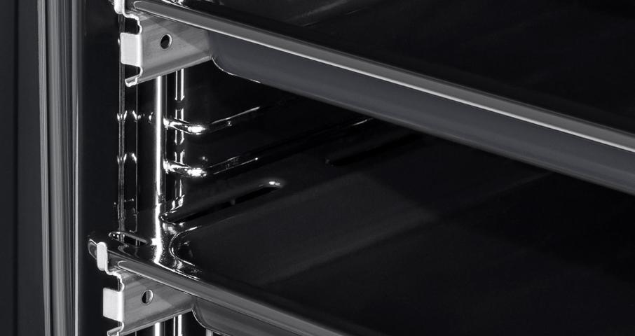 Внутри камеры установлены 2 уровня телескопических направляющих. Их использование безопасно и удобно при извлечении еды, приготовленной на противне или решетке гриля.