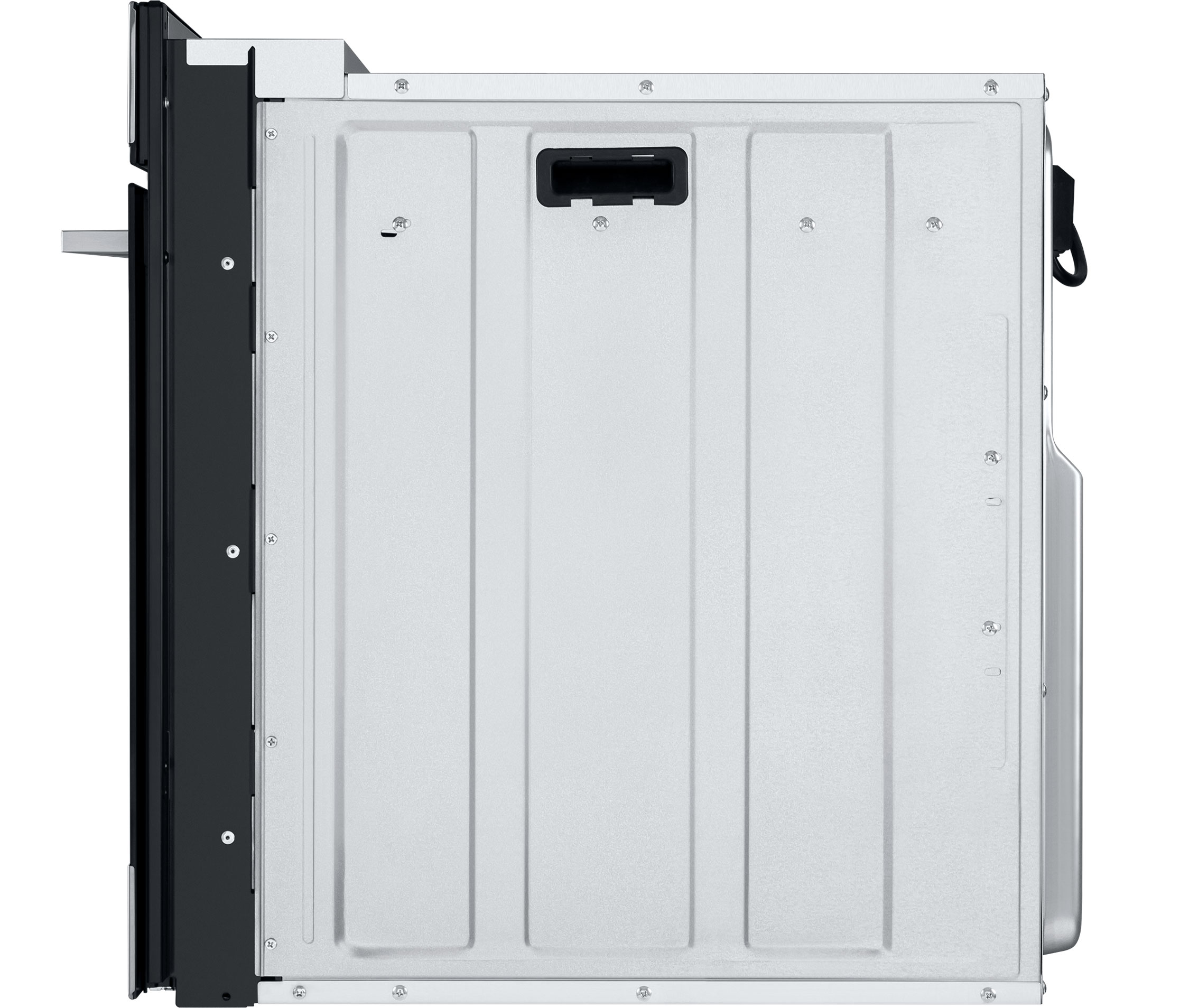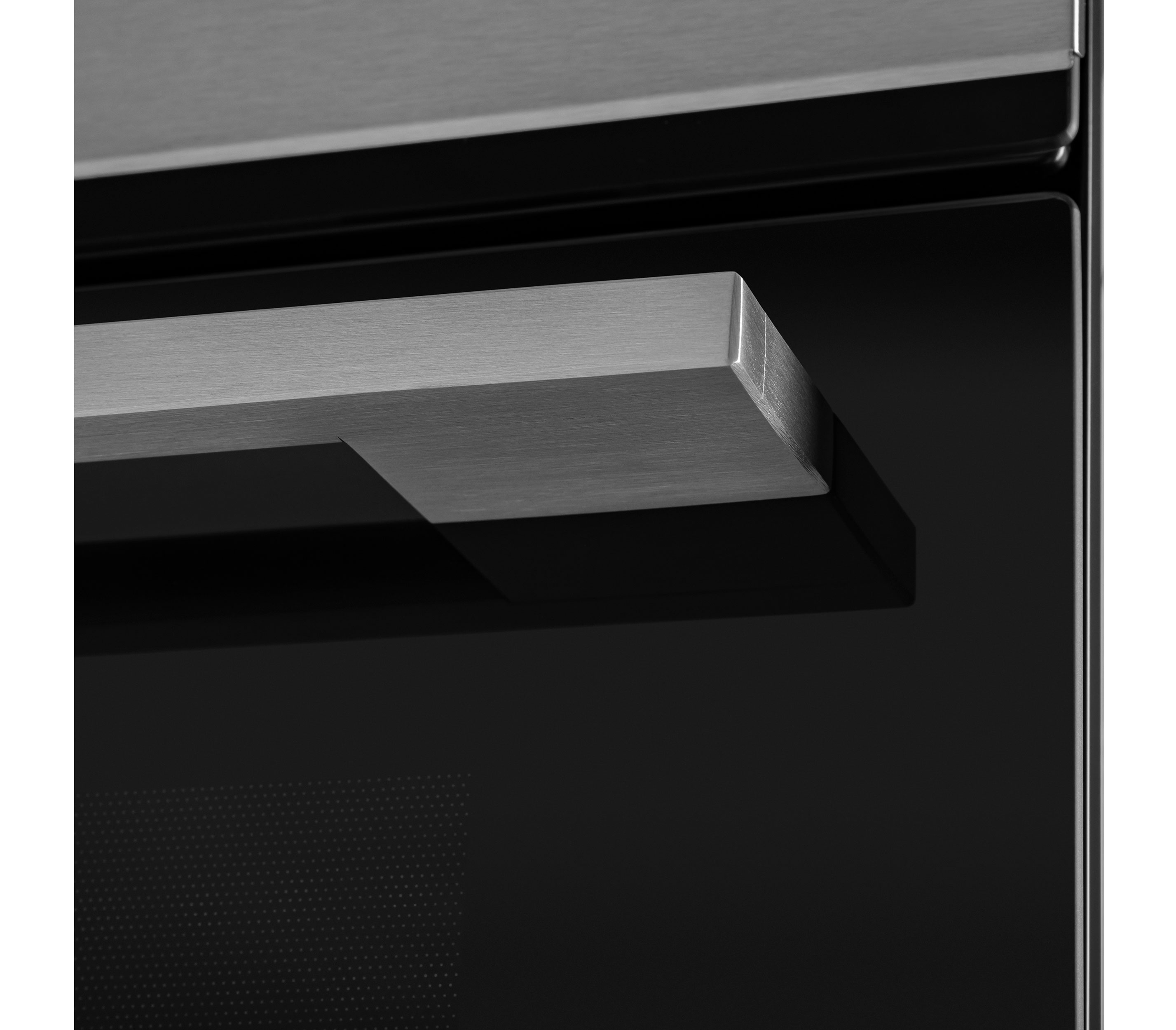 Фронтальная панель дверцы сделана из высококачественного жаропрочного стекла черного цвета, окрашенного по всему объему, что является отличительной чертой бытового прибора премиум-класса. Лицевая часть блока управления, нижняя часть фасада и ручка дверцы выполнены из полированной нержавеющей стали.