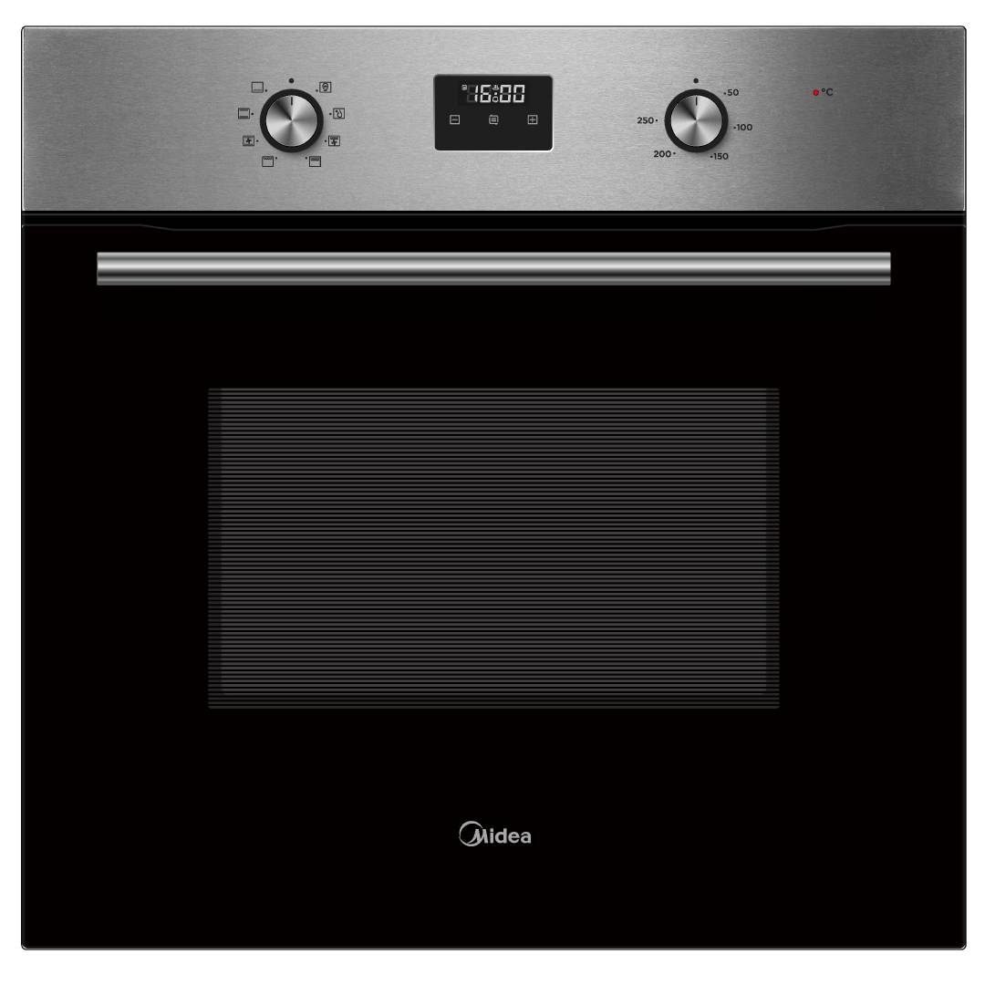 Электрический духовой шкаф Midea MO57103X объемом 70 л позволяет готовить большое количество блюд, обеспечивая равномерное пропекание до золотистой корочки. Модель оснащена грилем и конвекцией, благодаря чему горячий воздух внутри камеры распределяется равномерно. Устройство независимого типа нагревается до максимально температуры 250 °С. Для управления есть два утапливаемых переключателя. Текущая информация об оставшемся времени и цикле выводится на дисплее.