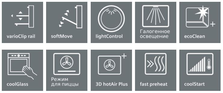 Дополнительно 3D горячий воздух, Верхний/нижний жар, Гриль с конвекцией, Большой гриль, Режим для пиццы, Режим coolStart для продуктов глубокой заморозки, Горячий воздух gentle, Подогрев готовых блюд