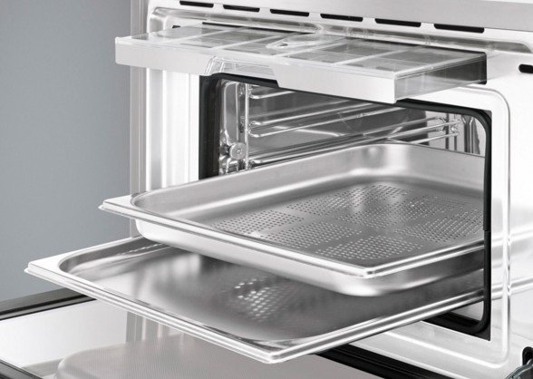 Комплектация | 1 решетка для противня, 1 глубокий противень, 2 решетки, 1 глубокий противень из перфорированной стали, 1 противень из перфорированной стали, 1 губка для удаления остатков воды |