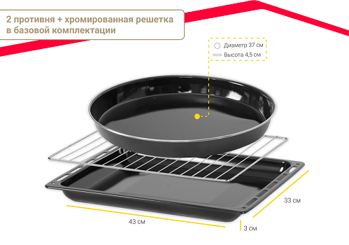 | Комплектация | стандартный противень, круглый глубокий противень, хромированная решетка, инструкция, гарантийный талон. |