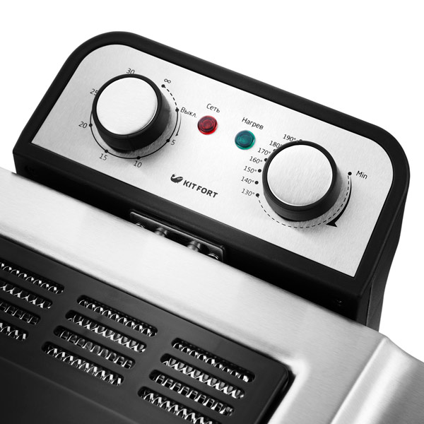 На панели управления находятся два поворотных переключателя. Один отвечает за регулирование температуры нагрева в диапазоне от 130 до 190 градусов, с помощью второго задаётся время жарки. По его истечении прибор отключается автоматически. При желании вы можете использовать устройство и без таймера, а контролировать процесс готовки вам поможет смотровое окно в крышке.