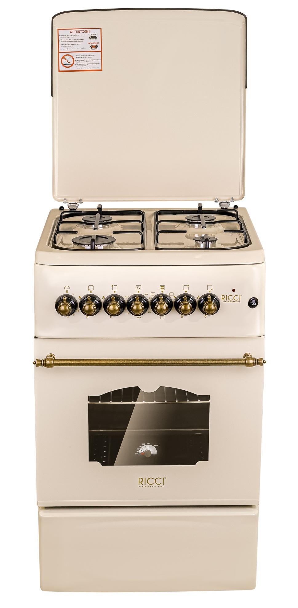 Четырехконфорочная газовая плита RICCI RGC 5004 BG имеет двойное стекло дверцы духового шкафа. В комплект входит 1 противень, 1 решетка, металлическая крышка.