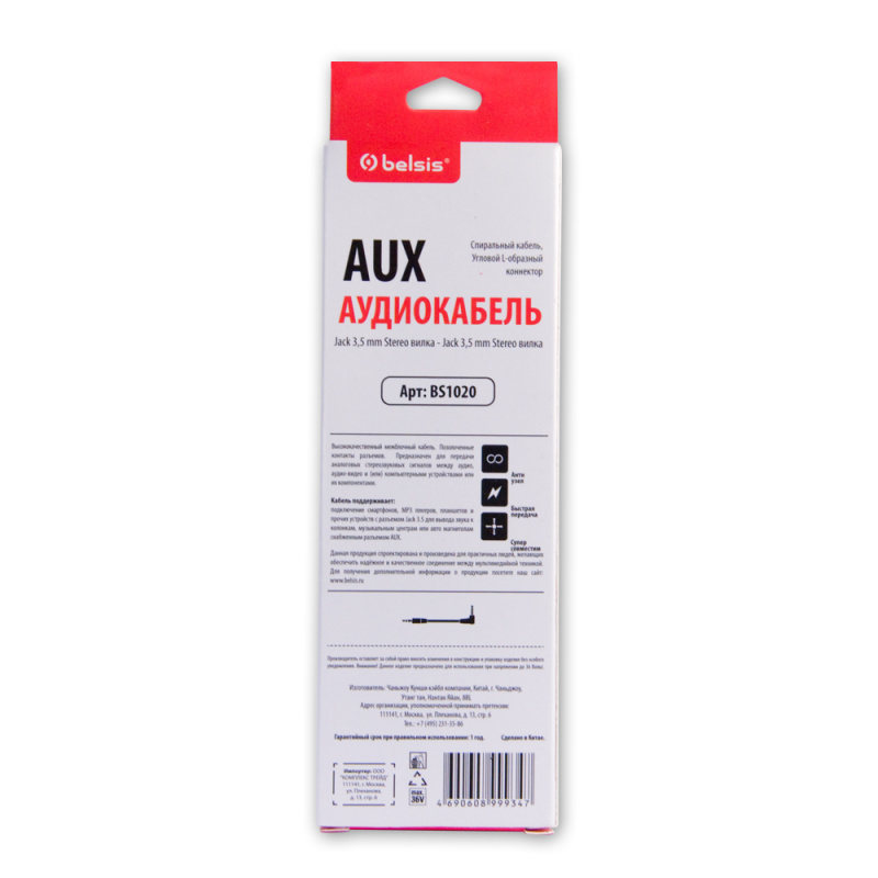 | Дополнительная информация | Аудио-кабель Jack - Jack, 3,5мм, спиральный, позолоченный, черный, 1,8 м BS1020 |