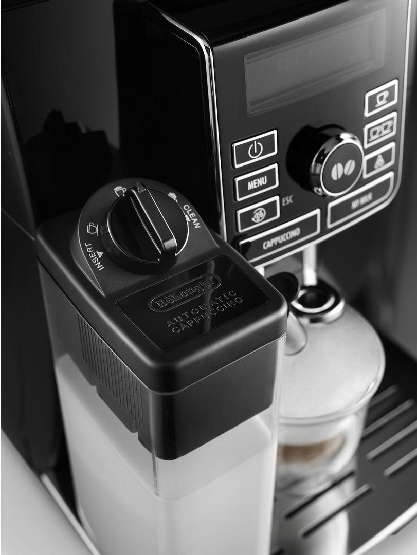 Данная модель позволяет приготовить различные виды кофе. DeLonghi ECAM 25.462.B оснащена долговечной кофемолкой с регулировкой до 13 степеней помола, что допускает использование как зернового, так и молотого кофе. Кофемашина имеет запатентованную систему «Автокапучино», что дает возможность получения молочной пенки одним нажатием. Автоматическая функция очистки, встроенная в регулятор плотности пенки, гарантирует очистку всех частей капучинатора. Кофемашина DeLonghi ECAM 25.462.B имеет функцию «Milk Mеnu». За один цикл работы производиться 1,8 л напитка, это позволяет приготовить две чашки за одно заваривание. Мощность 1450 Вт гарантирует высокую скорость приготовления напитков. Данная модель имеет функцию предварительного смачивания кофе.