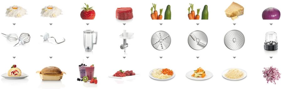 Дополнительная информация | Универсальная резка с 3 режущими дисками (двусторонняя терка, двусторонняя шинковка, терка для сыра/ шоколада/ орехов) |