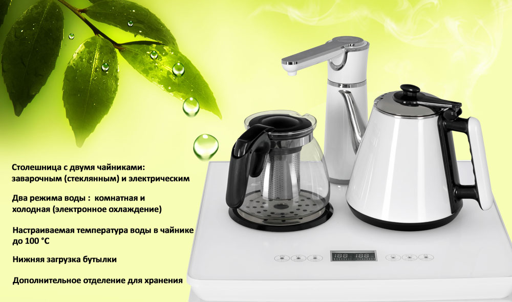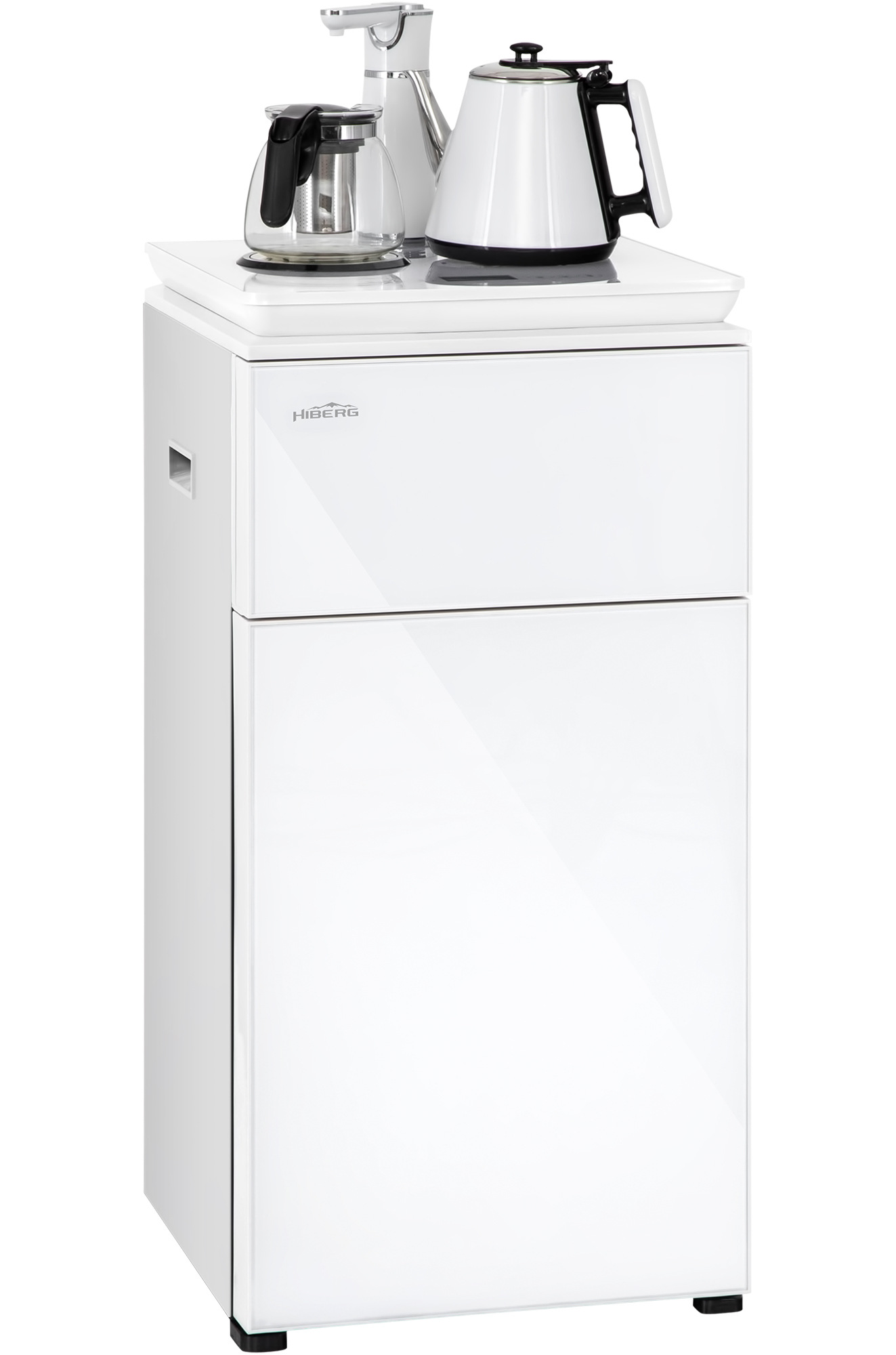 Hiberg F-91FGW – кулер с нижним расположением бутыли. Он подаёт воду – холодную либо комнатной температуры, а также греет её в электрическом чайнике до температуры от 40 до 100°.