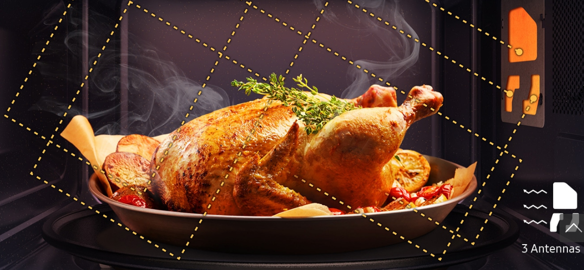 Уникальная и инновационная система распределения микроволн помогает достичь большего прогресса в готовке. Микроволны распределяются по 3 направлениям, благодаря трем антеннам внутри печи.