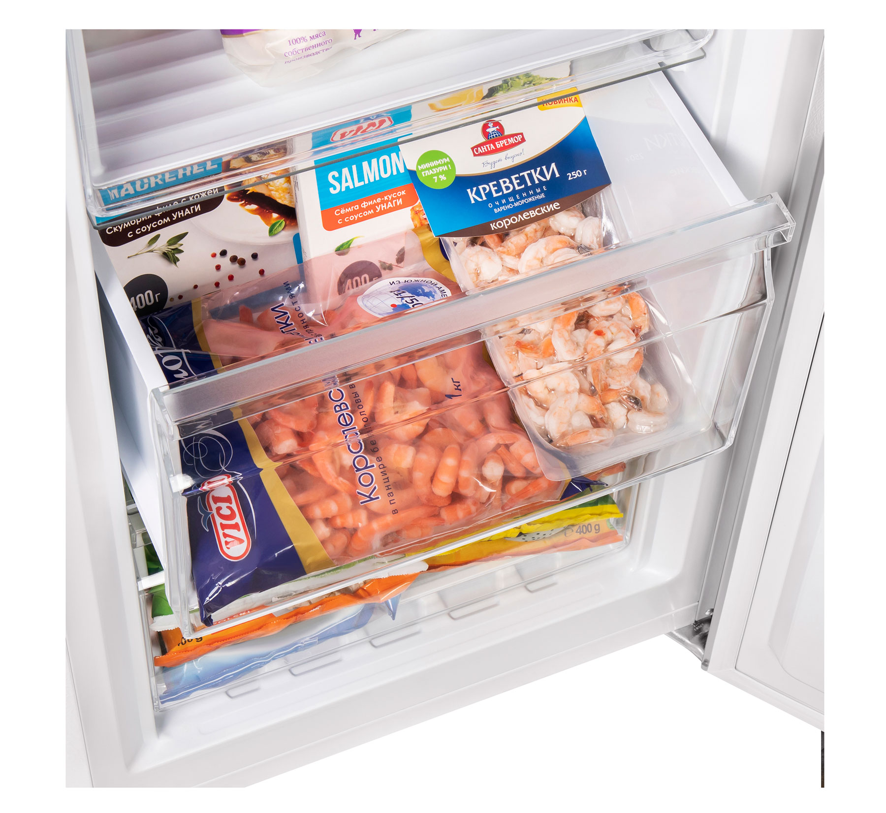 В комплекте: 3 полка, 4 ящика, 2 полки в двери, формочка для льда.