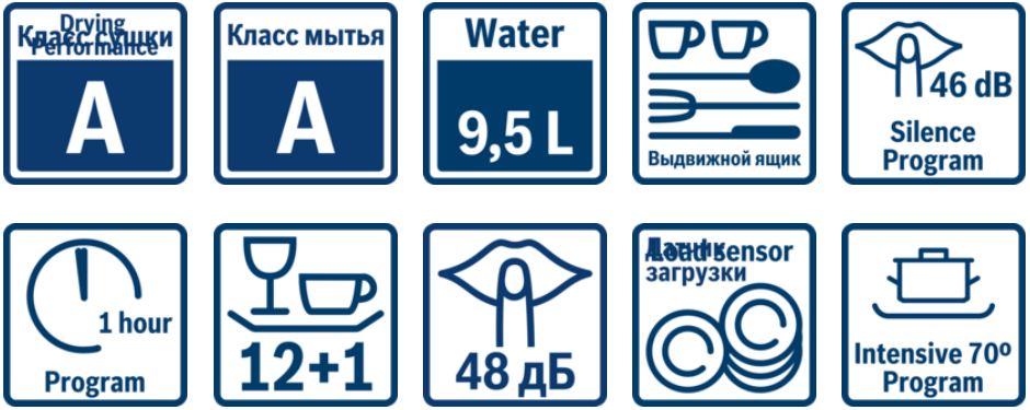 | Стандартные программы мойки | Интенсивная 70°, Авто 45°, Эко 50°, Ночная, 1-часовая 65° |