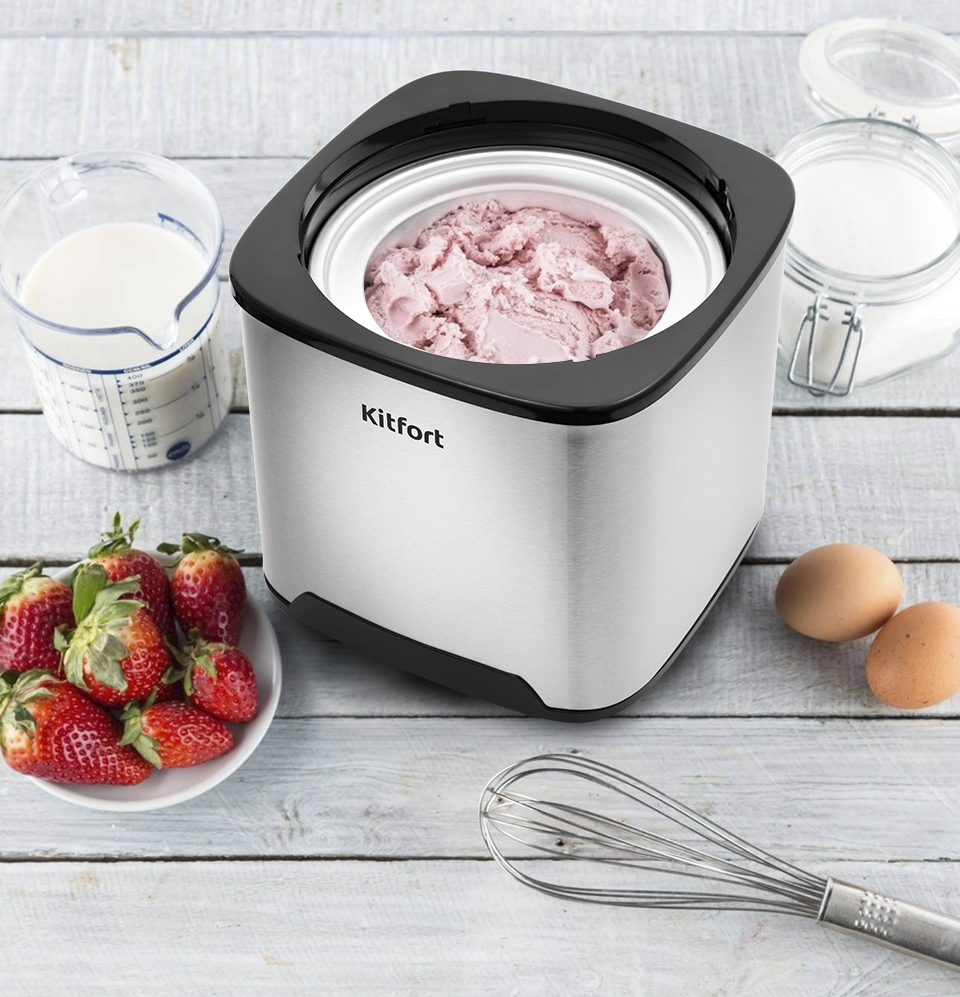 Полуавтоматическая мороженица Kitfort КТ-1809 поможет приготовить вам настоящее мороженое из натуральных продуктов, а также сорбет, джелато и замороженный йогурт.