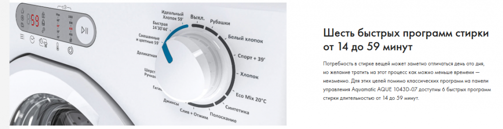 | Программы | ecomix 20°C, белый хлопок, быстрая 14’30’44’, гигиена, деликатная, джинсы, идеальный хлопок 59', отжим+слив, полоскание, рубашки, синтетика, смешанные и цветные 59’, спорт+ 39', хлопок, шерсть/ручная стирка |
