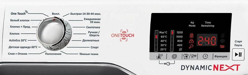 One Touch (интеллектуальный сенсорный ввод) Белый хлопок Хлопок + Предварит Хлопок Active Eco 20 Быстрая 44 мин Быстрая 30 мин Быстрая 14 мин Детская одежда Деликатная Спорт Темные ткани Синтетика Ежедневная (быстрая) 59 мин Ручная/Шерсть Полоскание Слив + Отжим