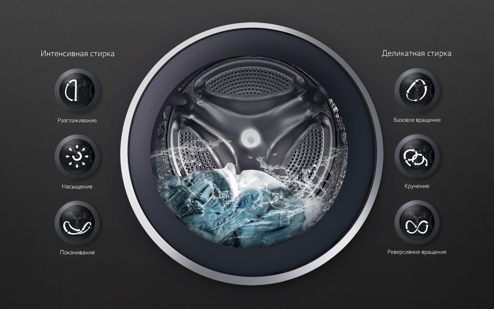 В отличие от обычных стиральных машин, барабан LG обладает широким набором вариантов вращения, максимально адаптированных к различным типам ткани и степени загрязнения белья.