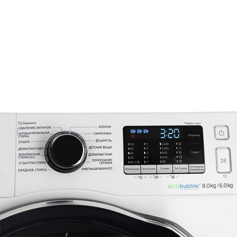 | Программы | Детские вещи, Хлопок, Ежедневная стирка, Удаление запахов, Очистка барабана Eco, Верхняя одежда, Полоскание+отжим, Экономичная Eco, Синтетика, Шерсть, Дезинфекция, Сушка хлопчатобумажных вещей, Сушка синтетики, Быстрая стирка (15 минут) |