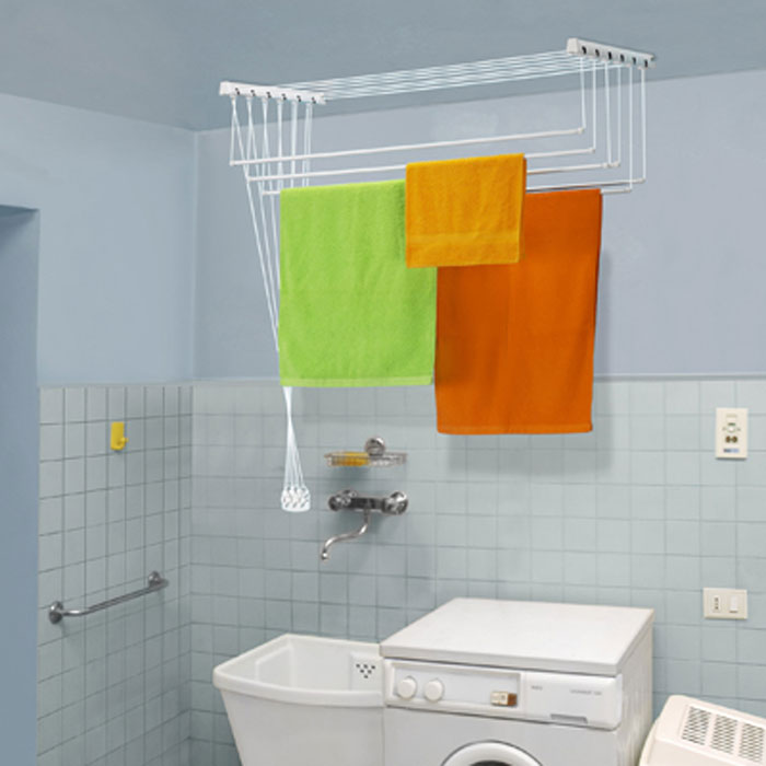 Сушилка Gimi "Lift 160" представляет собой пластиковые стержни, закрепленные при помощи направляющих шнуров на стальных кронштейнах, которые в свою очередь крепятся на стену или потолок. Специальный механизм (пластиковые ролики) обеспечивает подъем и опускание стержней, что значительно облегчает процесс развешивания белья. Стержни сушилки, на которые развешивается белье, устанавливаются до нужного для вас уровня, в зависимости от вашего роста.
