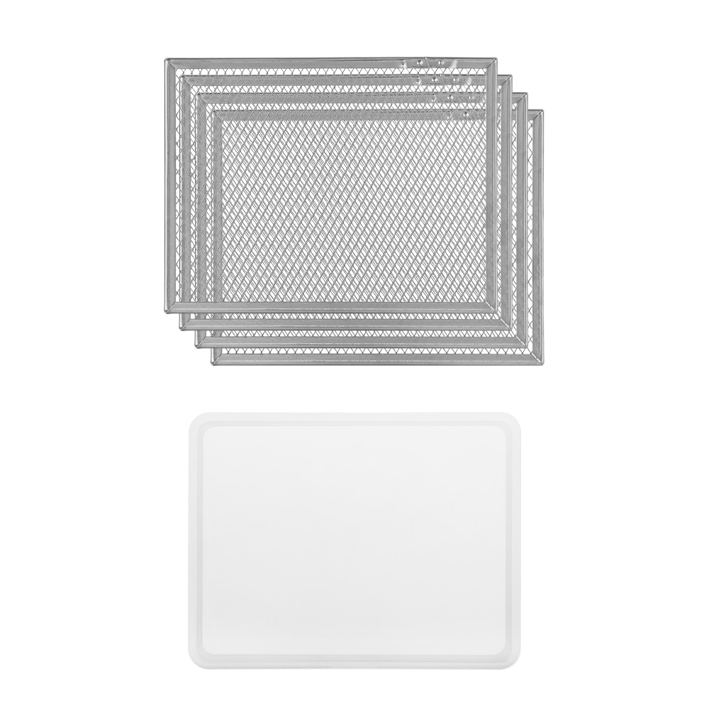 Сушилка имеет в комплекте 4 вместительных поддона с сеткой из нержавеющей стали и 1 поддон для жидкостей.