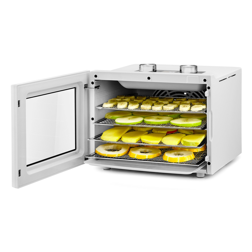 Благодаря компактному корпусу и оптимальному количеству поддонов сушилка для овощей и фруктов не займёт много места у вас на кухне. А через встроенное прозрачное окошко из закалённого стекла вы легко сможете наблюдать за процессом сушки.