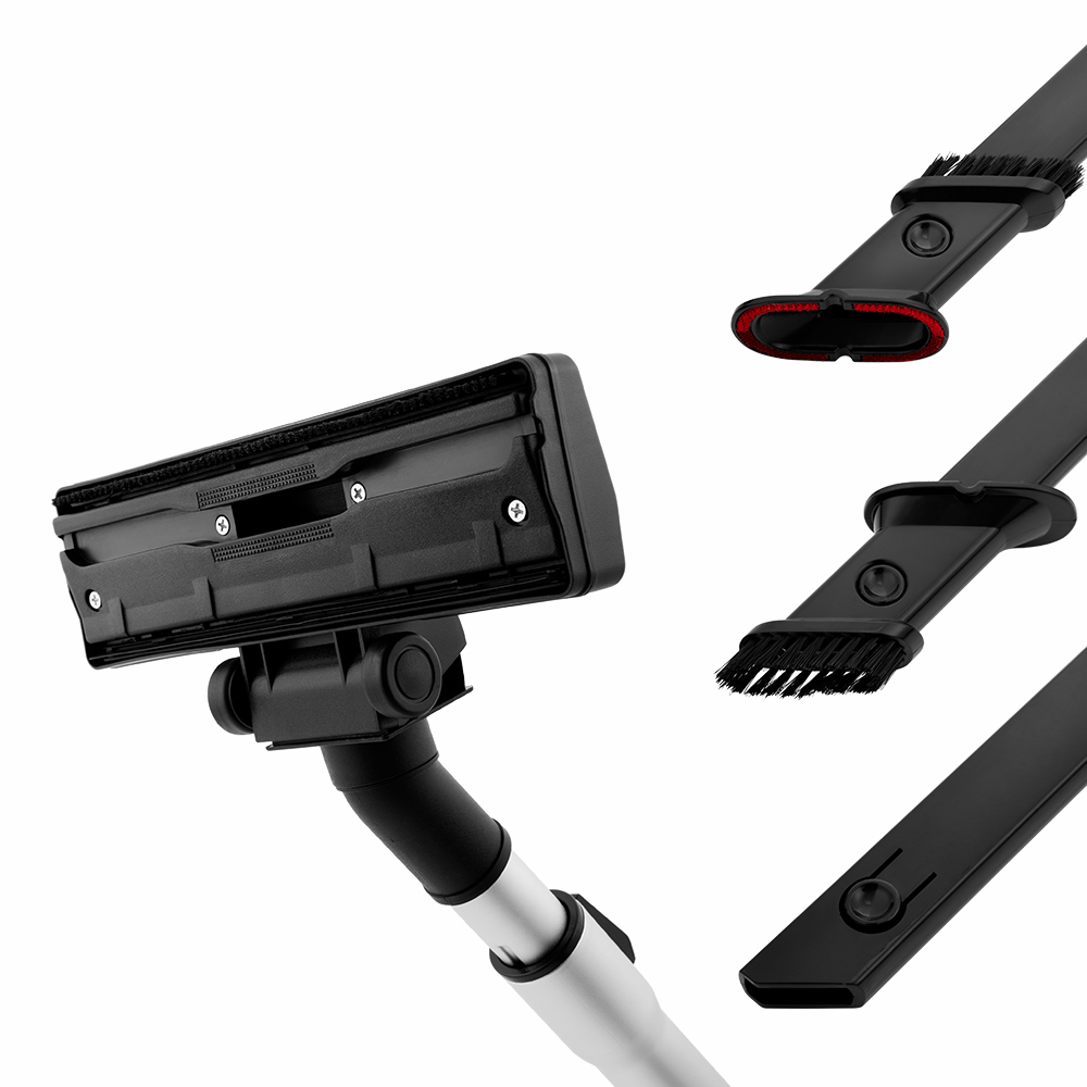 В комплекте с пылесосом идёт удобная напольная щётка, которая используется для чистки ковровых покрытий и удаления шерсти животных. А также узкая насадка «3 в 1» с длинным и коротким ворсом для чистки неровных и рифлёных поверхностей, углов, плинтусов.