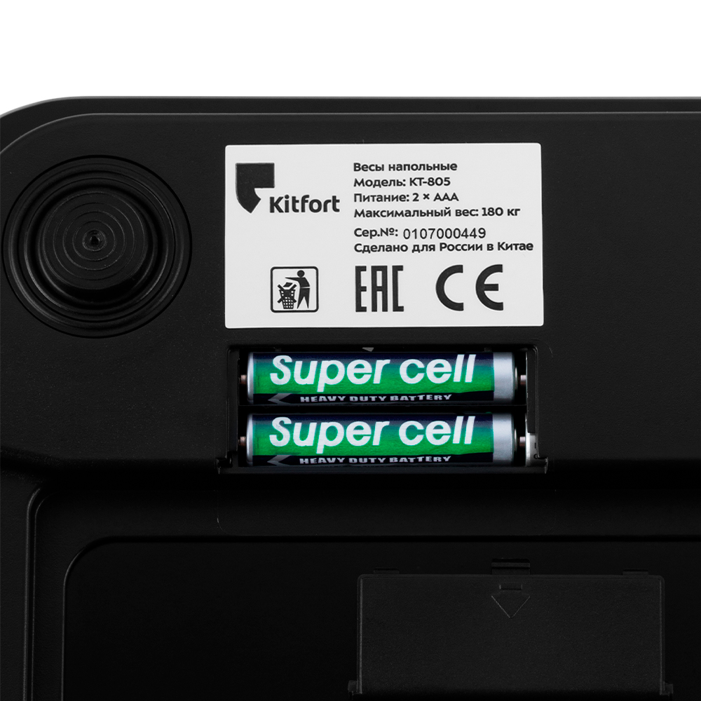 На обратной стороне устройства находится разъём для батареек. Низкое энергопотребление обеспечивает бесперебойную работу устройства от одного комплекта из двух батареек AAA. Включение и выключение весов происходит автоматически.