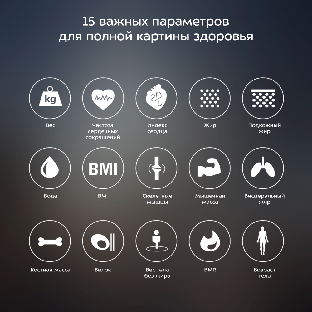 | Особенности | приложение «Fitdays» ,прорезиненные ножки, режим «Baby Mode», минимальный вес 6 кг, рабочий диапазон температур от +10 до +40 °C, Android 6.0 и выше, система iOS 8.0 и выше |