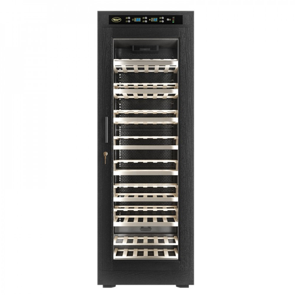 Температурный режим может быть выставлен любой в диапазоне от +5 до +22 ˚С. Уникальная опция линейки данных шкафов - наличие цифрового контроля влажности. Тип охлаждения - компрессорный. Корпус данного винного шкафа классический из дерева черного цвета (шпон дуба). В базовой комплектации имеются деревянные выкатные полки в количестве 8 штук.