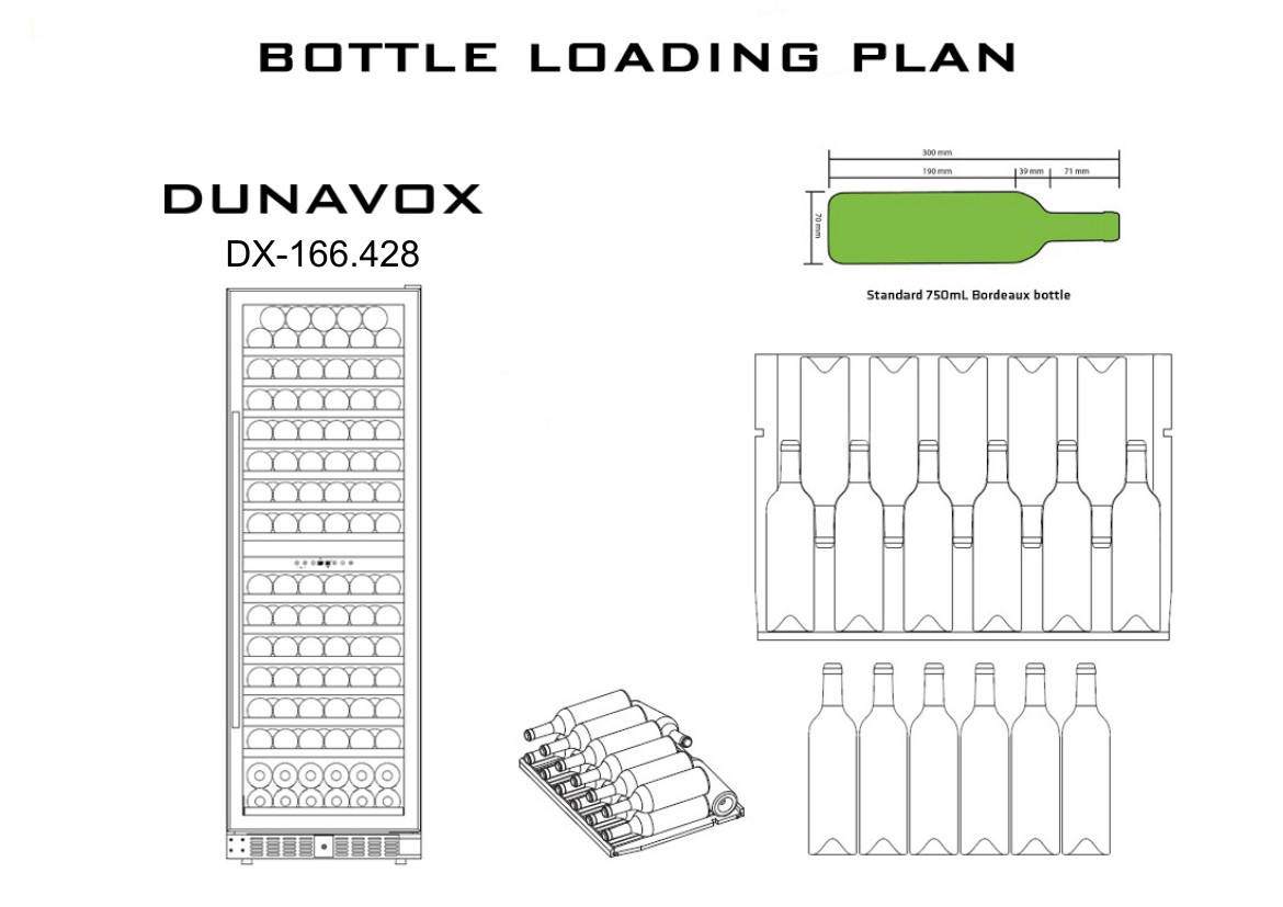 Рекомендуется устанавливать винный шкаф Dunavox DX-166.428DBK вдали от прямых солнечных лучей и источников тепла (духовки, нагревателя, батареи и т.д.). Прямой солнечный свет может плохо повлиять на корпус, а источники тепла могут увеличить энергопотребление. Не допускается установка аппарата рядом с плитой или прибором, который может нагревать воздух в пространстве 1-5 см от его корпуса (например, рядом схолодильником, у которого теплообменная стенка граничит с аппаратом). Не рекомендуется устанавливать прибор на полы с подогревом без специальной термоизолирующей подложки.
