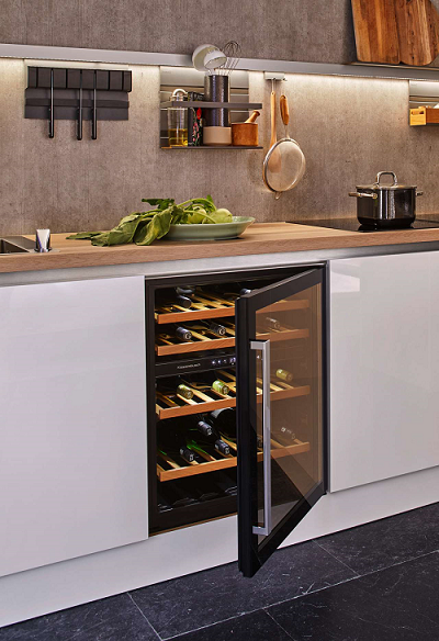 Электронная панель управления расположена в центре, на разделяющей температурные зоны перегородке. Для хранения используются выдвижные деревянные полки. Так же пригодится изменяемая навеска двери.